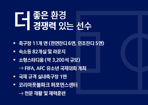 한국축구의 랜드마크로 새롭게 거듭날 코리아풋볼파크는 충남 천안시 서북구 입장면 코리아풋볼파크1로 55 일대에 478,000㎡ 규모로 2025년 12월 완공 되었다.