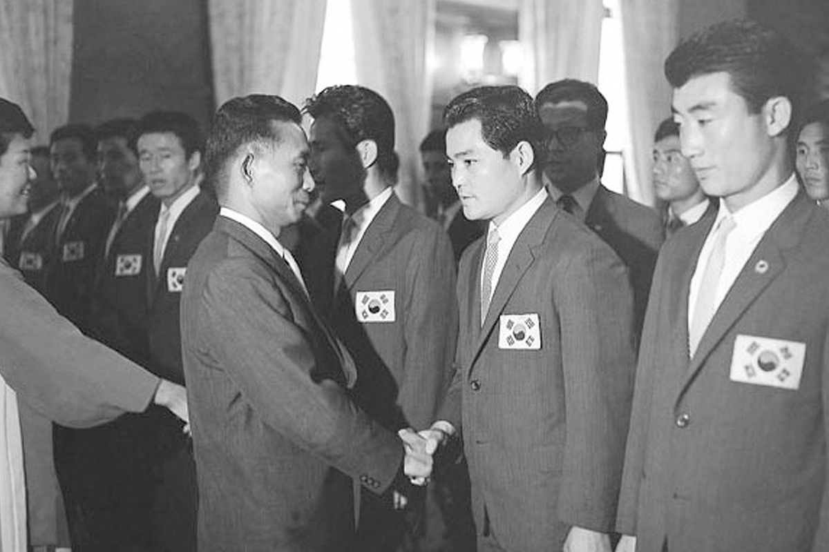 1965말레이시아에서 열린 메르데카컵의 우승을 차지한 한국대표 선수들이 청와대를 방문, 박정희 대통령의 환영을 받고 있다.