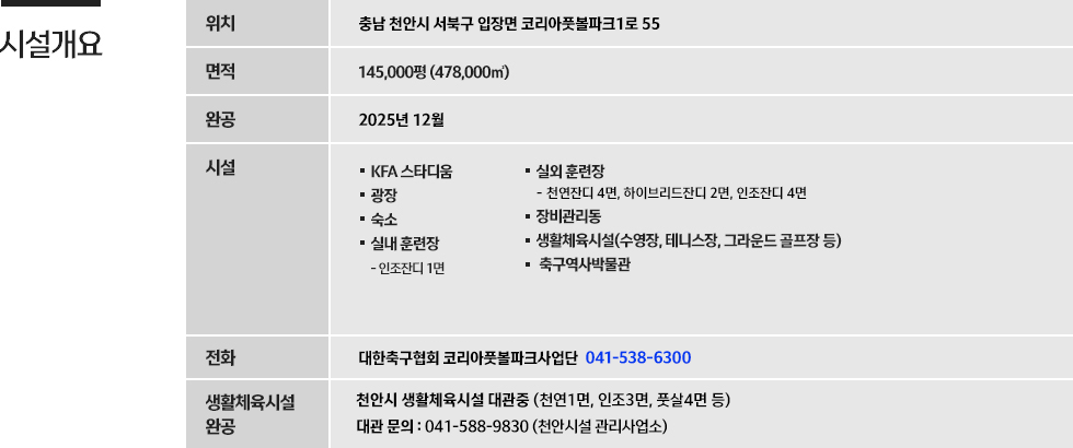 한국축구의 랜드마크로 새롭게 거듭날 코리아풋볼파크는 충남 천안시 서북구 입장면 코리아풋볼파크1로 55 일대에 478,000㎡ 규모로 2025년 12월 완공 되었다.