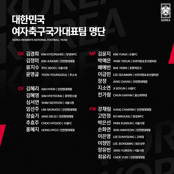 MF 지소연, 김윤지(이상 수원FC위민), 장창(인천현대제철), 천가람(울산과학대), 배예빈(포항여전고), 이금민, 박예은(이상 브라이튼&호브알비온)