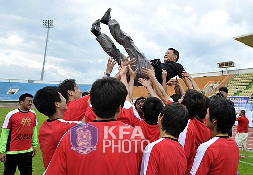 선수들에게 우승 헹가레를 받는 이현창 감독 ⓒKFA 홍석균