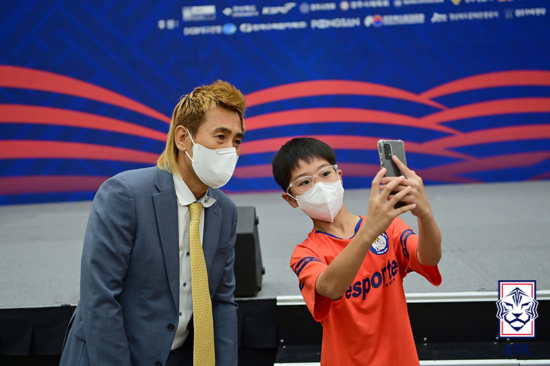'와~ '꽁병지'다!' 화랑FC의 선수가 개회식에 참석한 김병지 KFA 부회장과 기념사진을 촬영하고 있다.