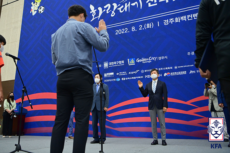 정몽규 회장이 개회식에서 선수 대표와 지도자 대표의 선서를 함께하고 있다.