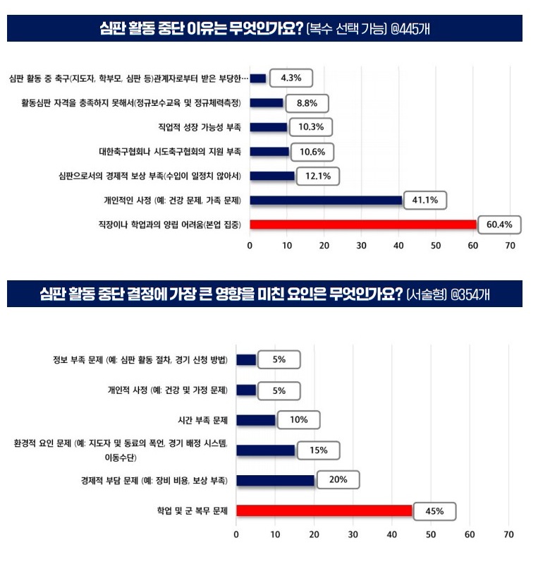 또한 ‘심판 활동 중단 결정에 가장 큰 영향을 미친 요인(서술형)’으로는 학업 및 군 복무 문제(45%), 경제적 부담 문제(20%), 환경적 요인 문제(15%), 정보 부족 문제(5%) 등으로 나타났다. 경제적 부담 문제는 장비 구매와 이동 거리에 따른 교통비 등 경제적 보상의 부족을 이야기하며, 환경적 요인 문제는 지도자와 동료의 폭언이나 이동 거리에 대한 부담 등을 말한다. 또 정보 부족 문제는 심판 활동 절차나 경기 신청 방법 등의 정보를 접하기 힘든 경우를 뜻한다.