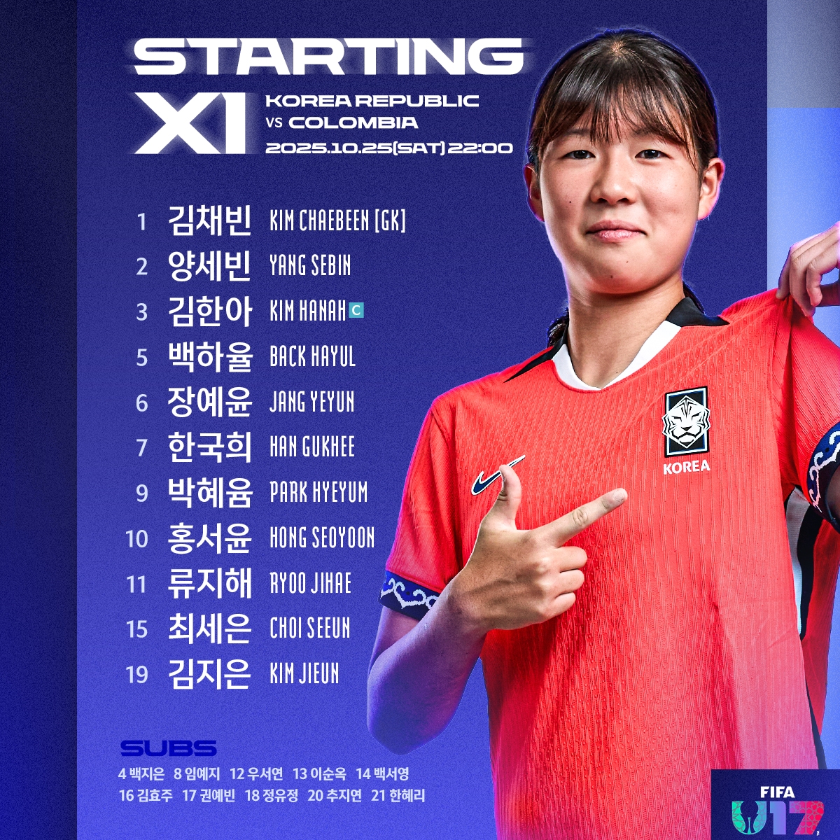 FP: 장슬기' 이한운' 신담영' 이정은' 이유나(전37 김나리)' 김아름' 김다혜' 여민지' 이금민(H.T 전은하; 후14 주수진)' 김빛나