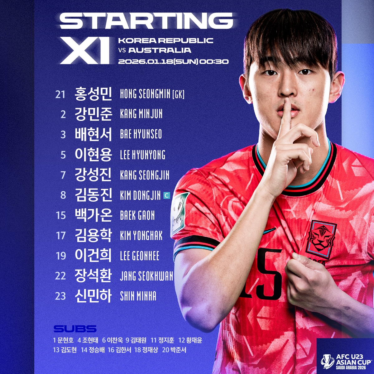 ‘백가온 선발’ U-23 대표팀, 호주전 선발명단 발표